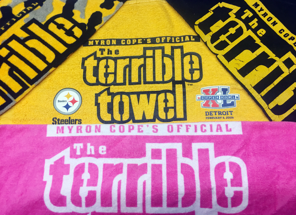 EVERYTHING IS COOL WITH THE TERRIBLE TOWEL AND ITS ALL BECAUSE OF THE LATE MYRON COPE SPORTS WRITER AND TV ANNALIST BUT BEST KNOW AS THE RADIO BROADCASTER FOR THE PITTSBURGH STEELERS, THAT HE DID FOR 35 YEARS. MYRON COPE WAS BORN ON JANUARY 23, 1929 IN PITTSBURGH PENNSYLVANIA TODAY WE HONOR HIM FOR HIS CREATIVE CALLS, AND THE CATCH PHRASE HE CAME UP WITH, WHILE CALLING PLAY BY PLAY GAMES FOR THE PITTSBURGH STEELERS. SUCH AS DOUBLE YOI, FEH, MMMHA AND FOR GIVING US THE TERRIBLE TOWEL A GIMMICK THAT STARTED IN 1975 THAT IS STILL RECOGNIZED AS THE SYMBOL OF THE STEELERS AND THE CITY OF PITTSBURGH. THE TERRIBLE TOWEL HAS BEEN AROUND THE WORLD WITH PEOPLE ON VACATION AND OUR MILITARY DISPLAYING THEIR PRIDE FOR THE CITY OF PITTSBURGH AND ALONG WITH THE PITTSBURGH STEELERS PLAYERS DURING PLAYOFF RUNS.MYRON COPE DIED ON FEBRUARY 27, 2008 AT THE AGE OF 79
